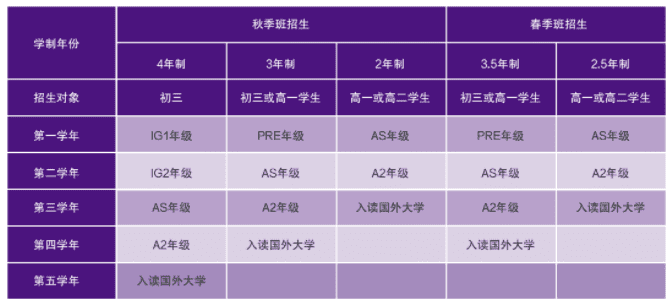 根據美高學校官方信息,目前學校的A-Level課程分為春季班、秋季班,春季班學制為2.5年制、3.5年制,秋季班為2年制、3年制、4年制。