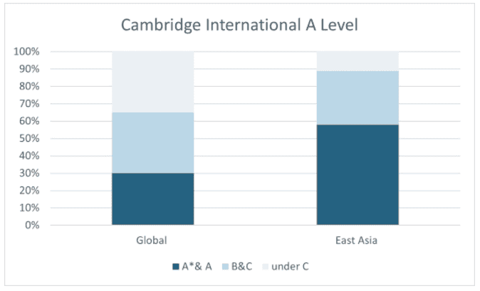 而東亞地區(qū)的A*&A率高達58%,高出全球28%,也與中國考生IB均分高出全球考試均分這一點是一致的,就是因為中國考生的考試能力普遍較高。